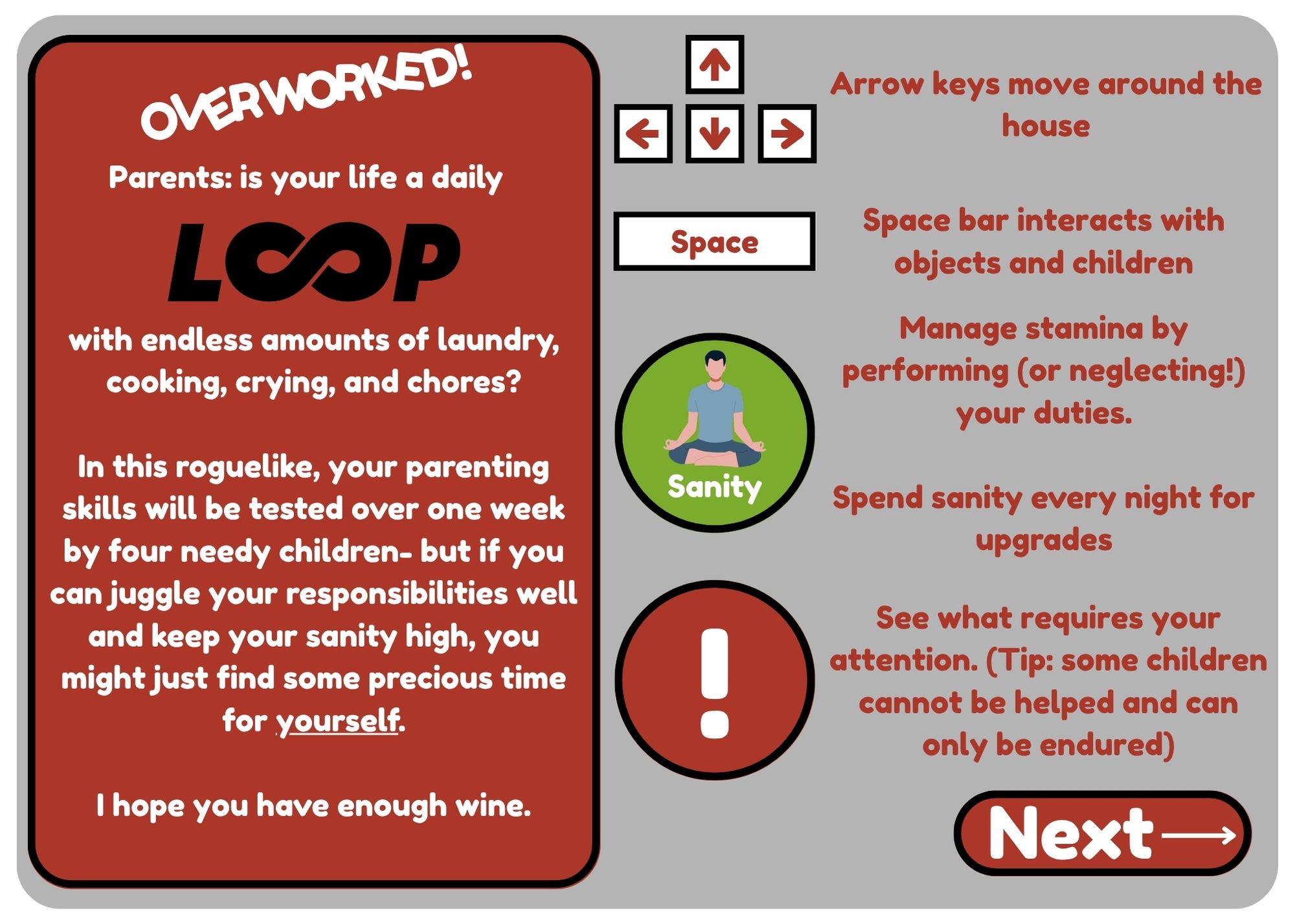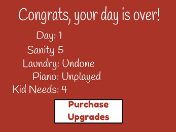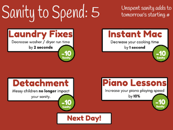 Parents: is your life a daily loop with endless amounts of laundry, cooking, crying, and chores? In this roguelike, your parenting skills will be tested over one week by four needy children- but if you can juggle your responsibilities well and keep your sanity high, you might just find some precious time for yourself.